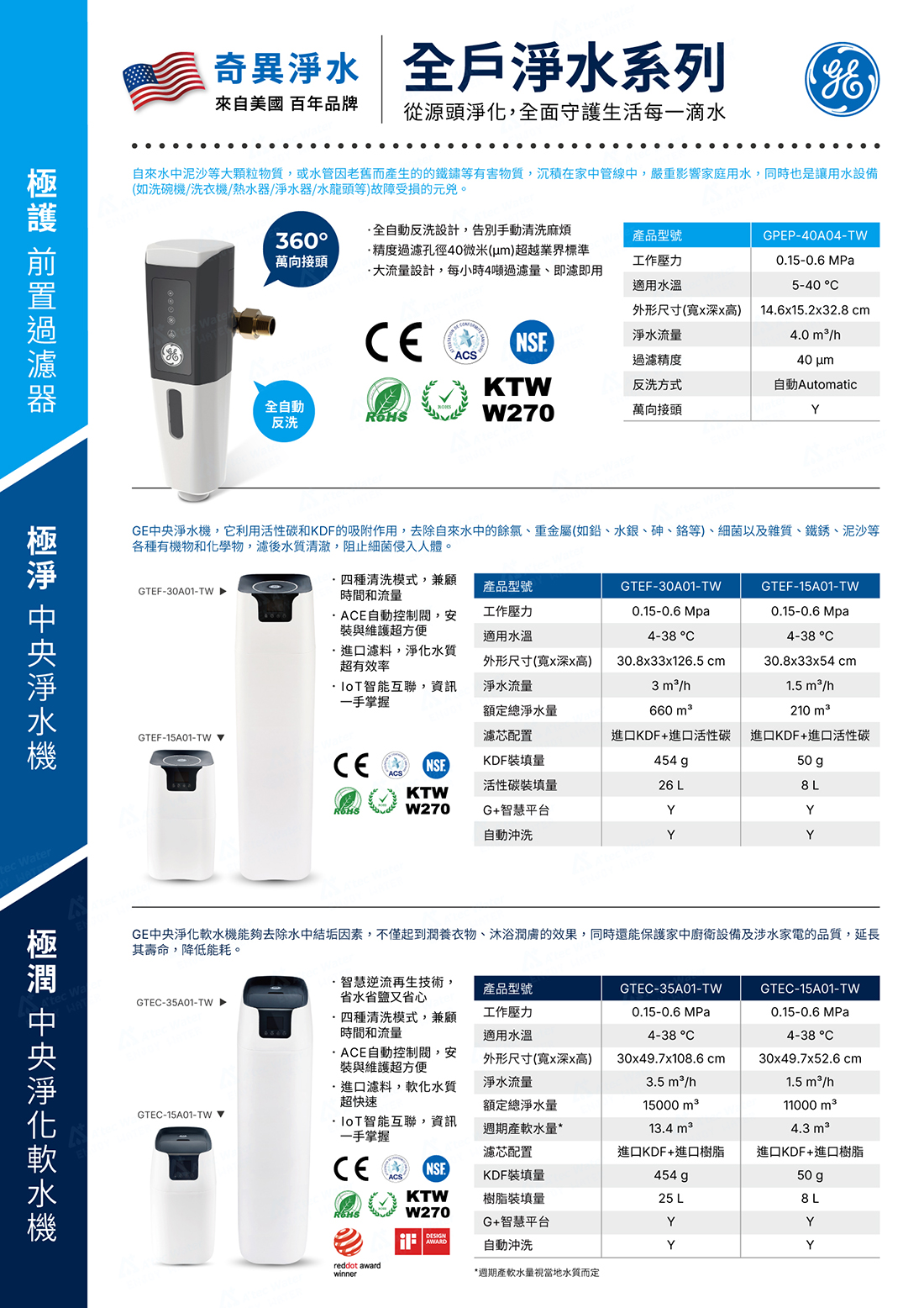 【奇異淨水】GTEF-15A01-TW 極淨-中央淨水機-小(15A)│ACE控制閥│食品級FRP罐體│loT智能連網│四種清洗模式│免費到府安裝