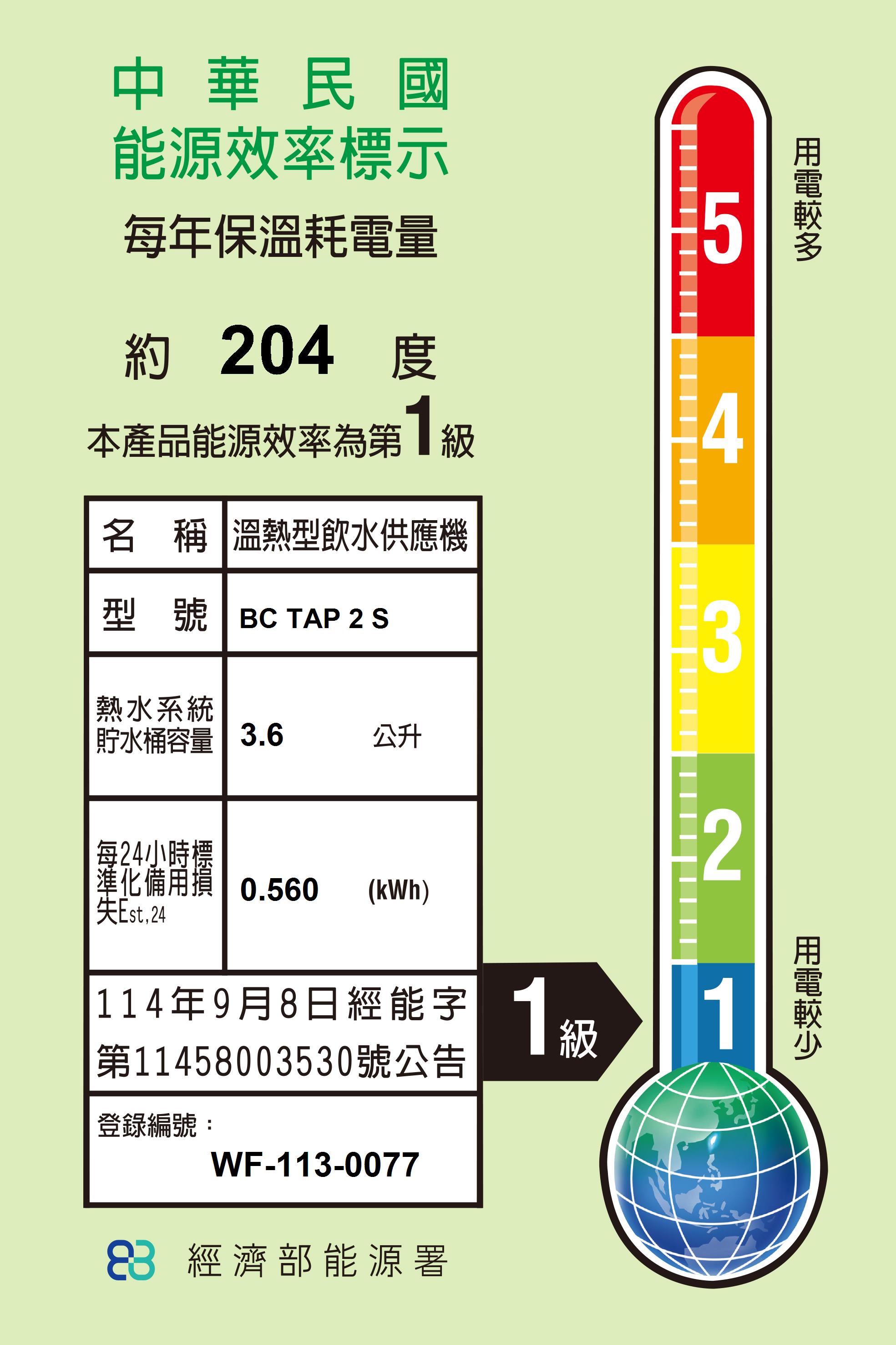 BC Tap 2 櫥下型冰溫熱飲水機結合了專利 M585889 智能照明光感應技術,開燈即開機、關燈即關機,免除傳統需每天設定開關的困擾。此外,BC Tap 2 櫥下型冰溫熱飲水機所搭配的加熱器擁有最佳省電等級「一級」能源效率,待機 24 小時僅耗費約 1.97 元,(以台電107年4月1日實施,夏季電費每度3.52元計算),落實節能環保,愛護地球。