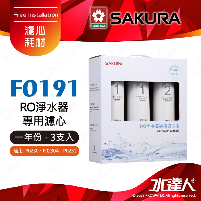 【SAKURA 櫻花】F0191 RO淨水器專用濾心 一年份《3支入》 ★適用P0230A .P0231. P0261. P0262 ★第一道F0161+第二道F0151 ★專利濾心卡榫 ★DIY省時省力-