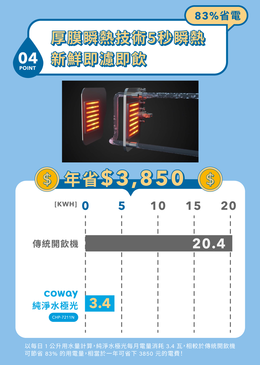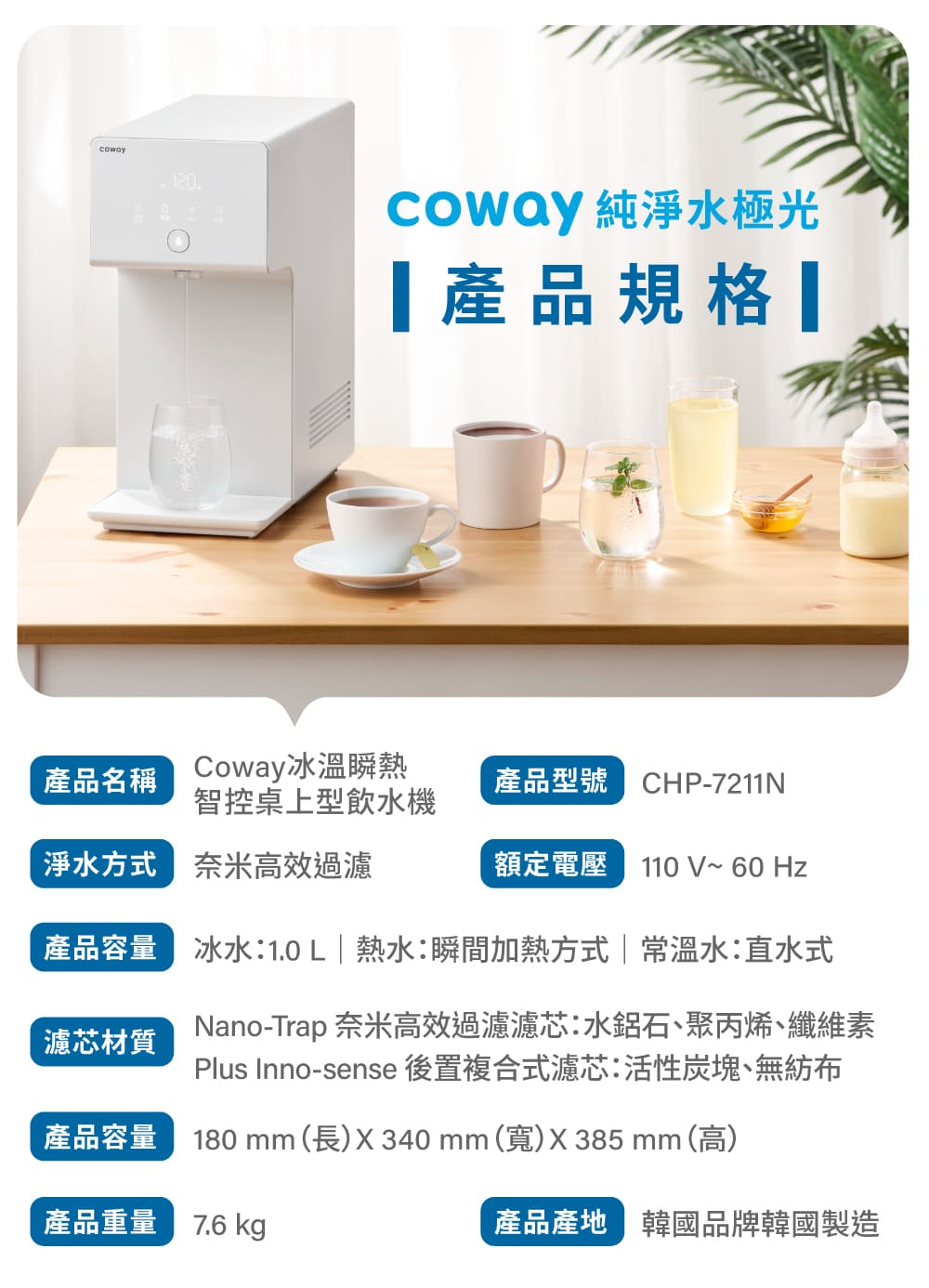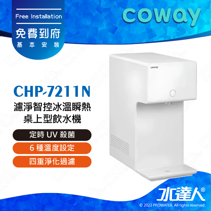 |CHP-7211N|四重淨化過濾(前置軟水濾芯2道+本體過濾濾芯2道)|6 種溫度設定|5 秒瞬熱即濾即飲|定時UV殺菌|無冷媒壓縮機|5 種水量設定|免費到府安裝