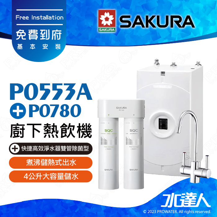 【SAKURA 櫻花】 P0553A 廚下熱飲機/雙溫飲水機│塔配P0780 快捷高效淨水器(雙管除菌型)│ 適用F0271/F0231濾心│專利濾心卡榫 快速換芯│有效除重金屬與有機污染物│濾除水中99.9%病菌│體積小│不佔空間│免費到府安裝